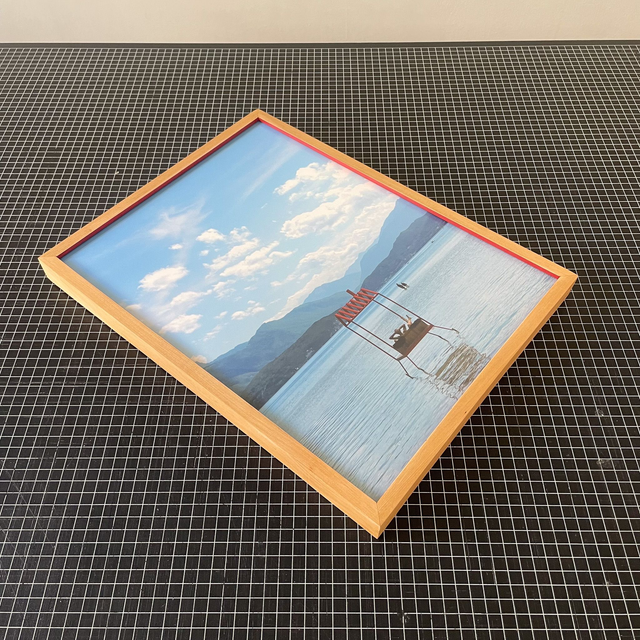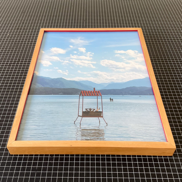 Enmarcación hecha a mano de madera mañío y borde interior rojo. Obra: fotografía de Santiago Bernales, impresa en papel fine art.