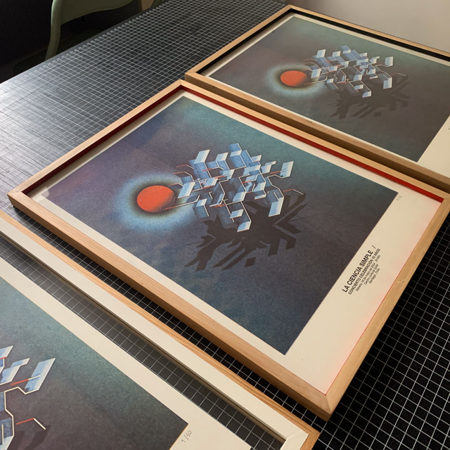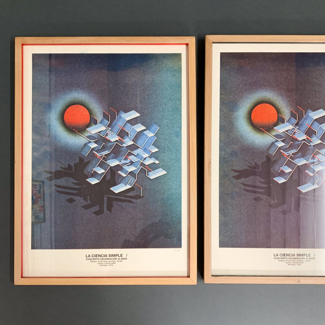 Póster 10 años de La Ciencia Simple de tamaño 33x45cm impreso en risografía, enmarcado en madera mañío y borde interior de color.