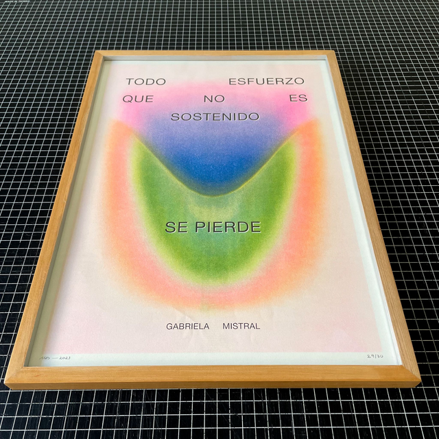 Risografía en cinco tintas de Margarita Echeñique enmarcada en madera mañío y borde interior plateado. Tamaño 31x43cm.